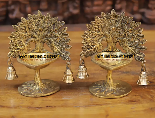 7.5" Brass Diya with kalpvruksh and bell (set of 2)